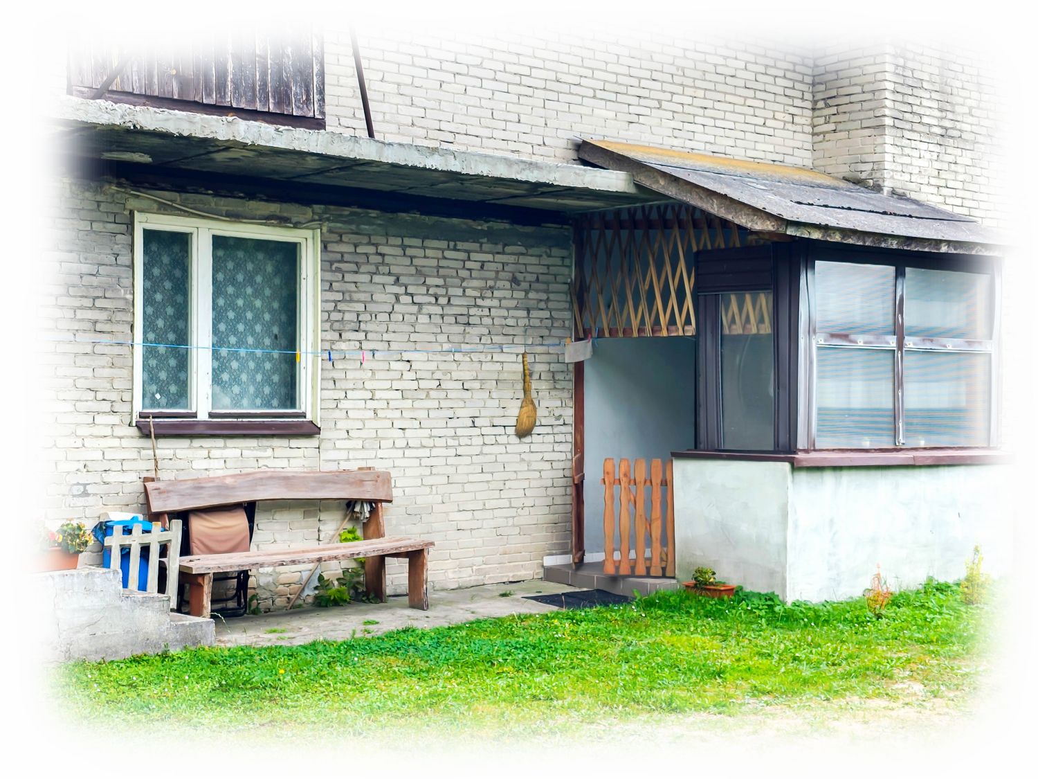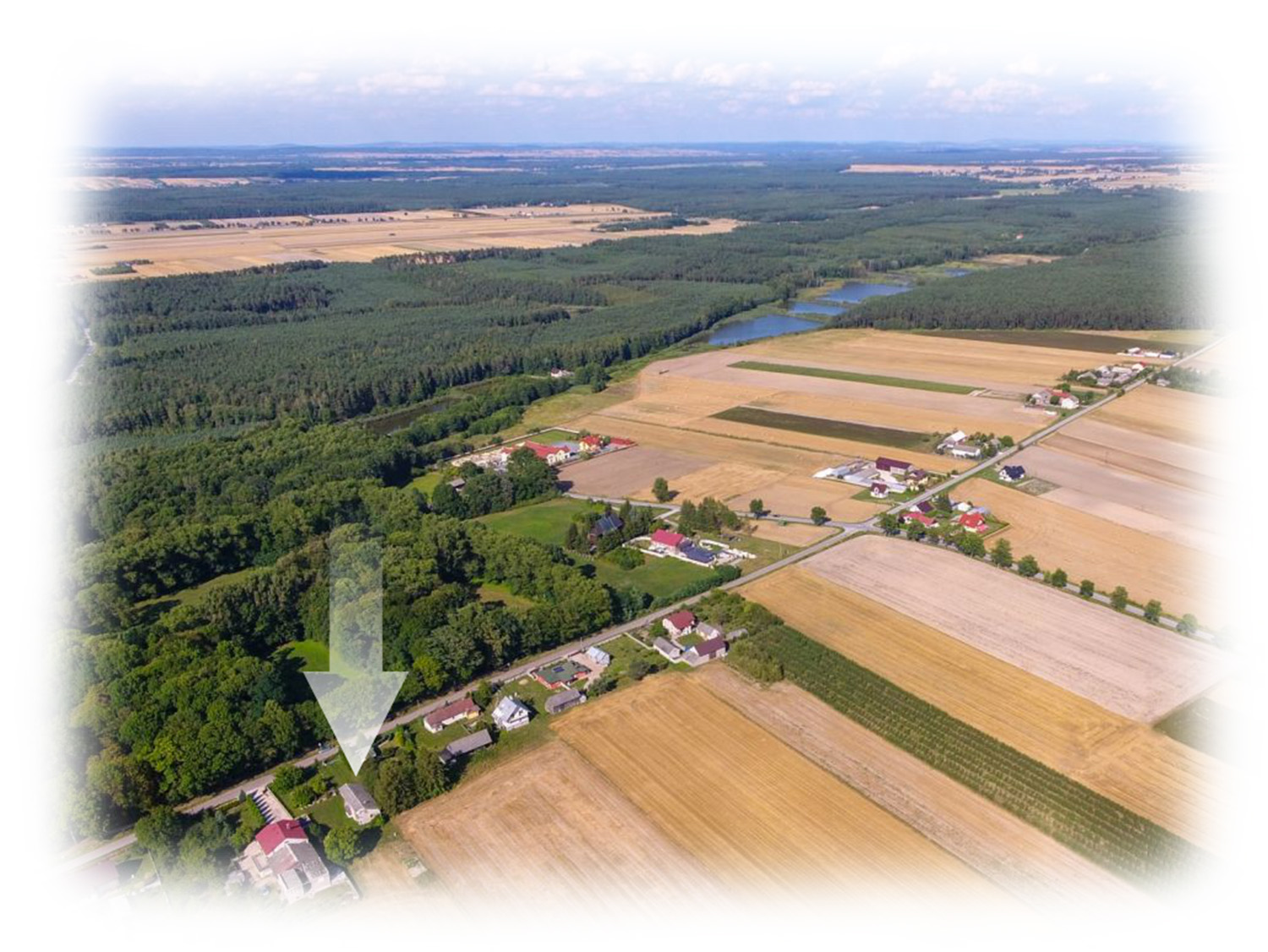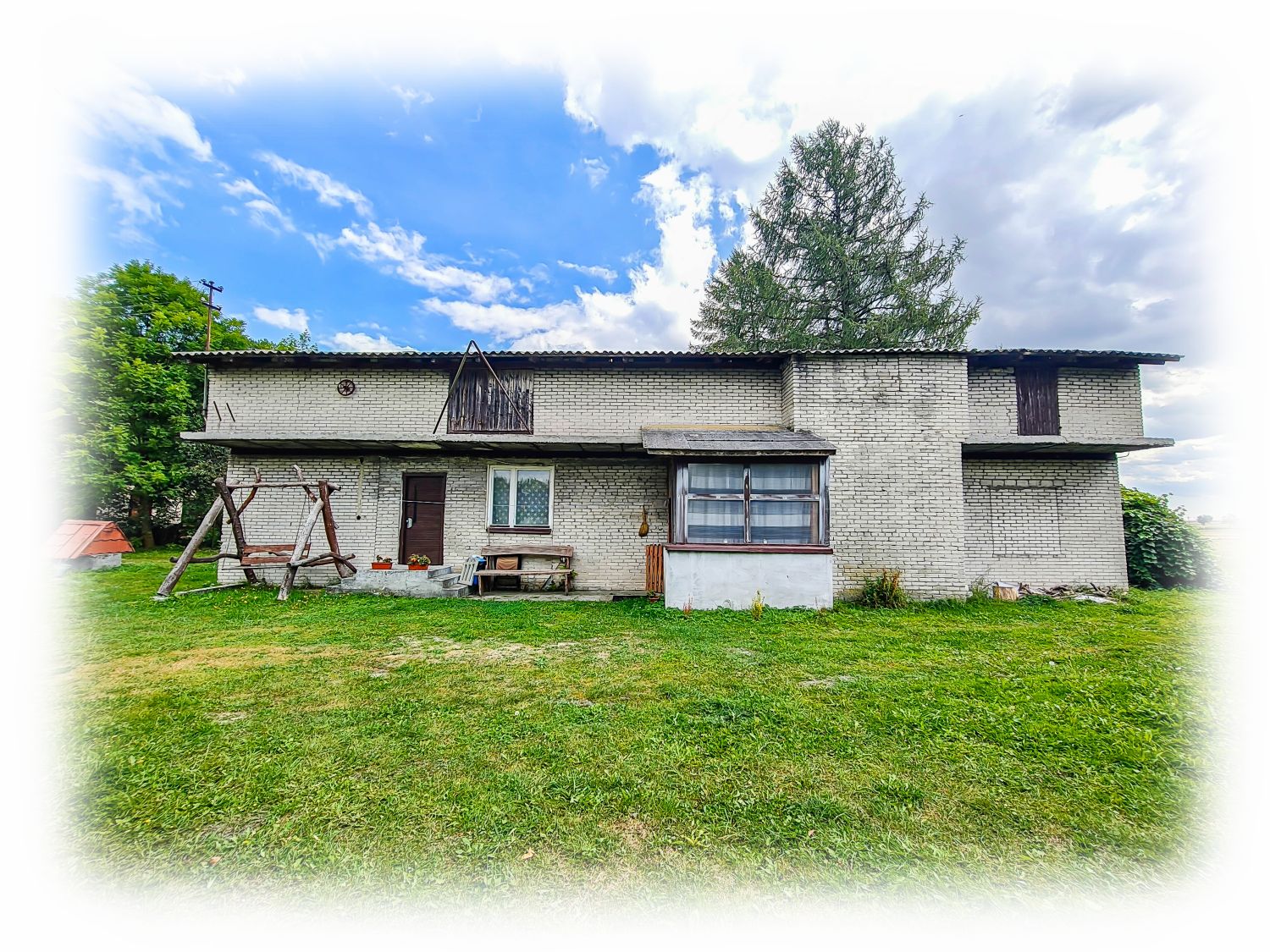 industrialny. Trawiaste podwórko, posesja otwiera się malowniczo na pola za budynkiem. Naprzeciwko